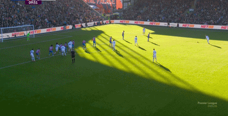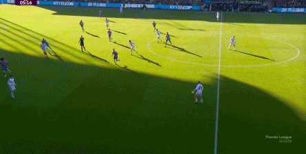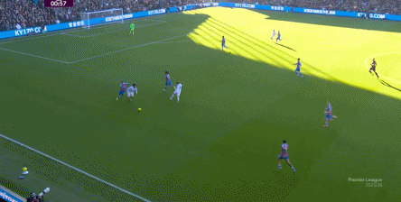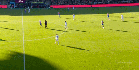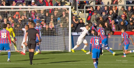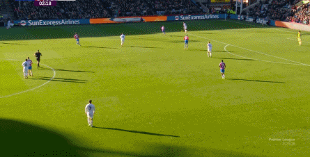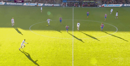 没有了埃泽,水晶宫用皮诺代替,全面性自然出现了很明显的下降,但确实通过皮诺矮小的身材补充了跑动量和灵活性,就像这次进攻,皮诺的确能保证来到后点,但打不进去就是他和埃泽的区别了: